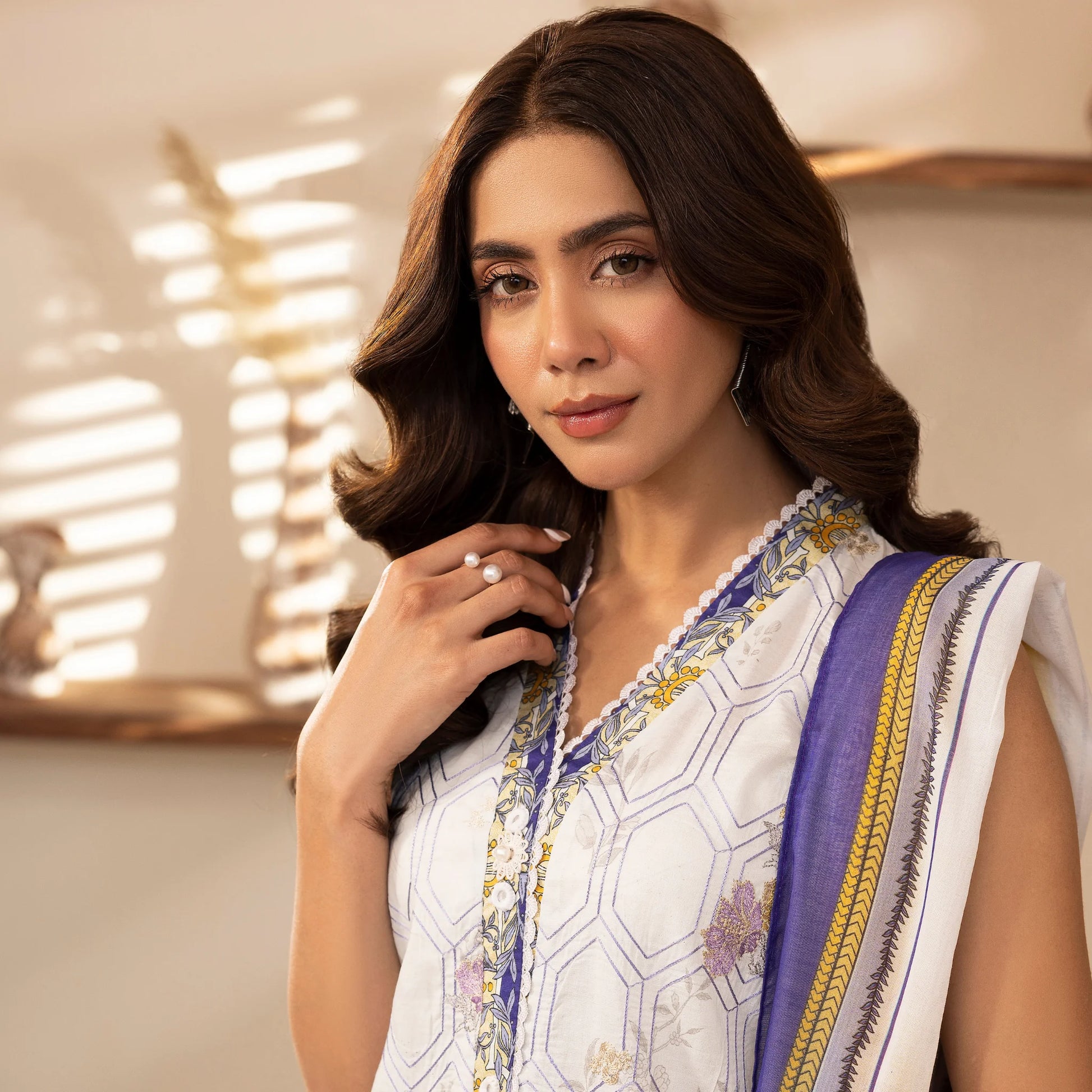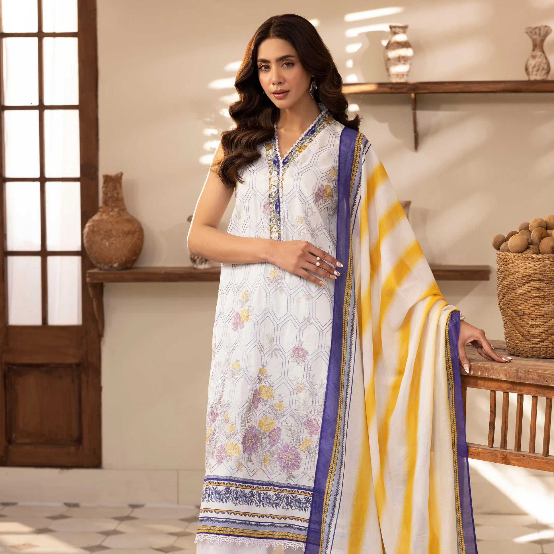 - 3-Piece Stitched Lawn Suit Features Elegant Embroidery and Digital Prints For a Stylish Look