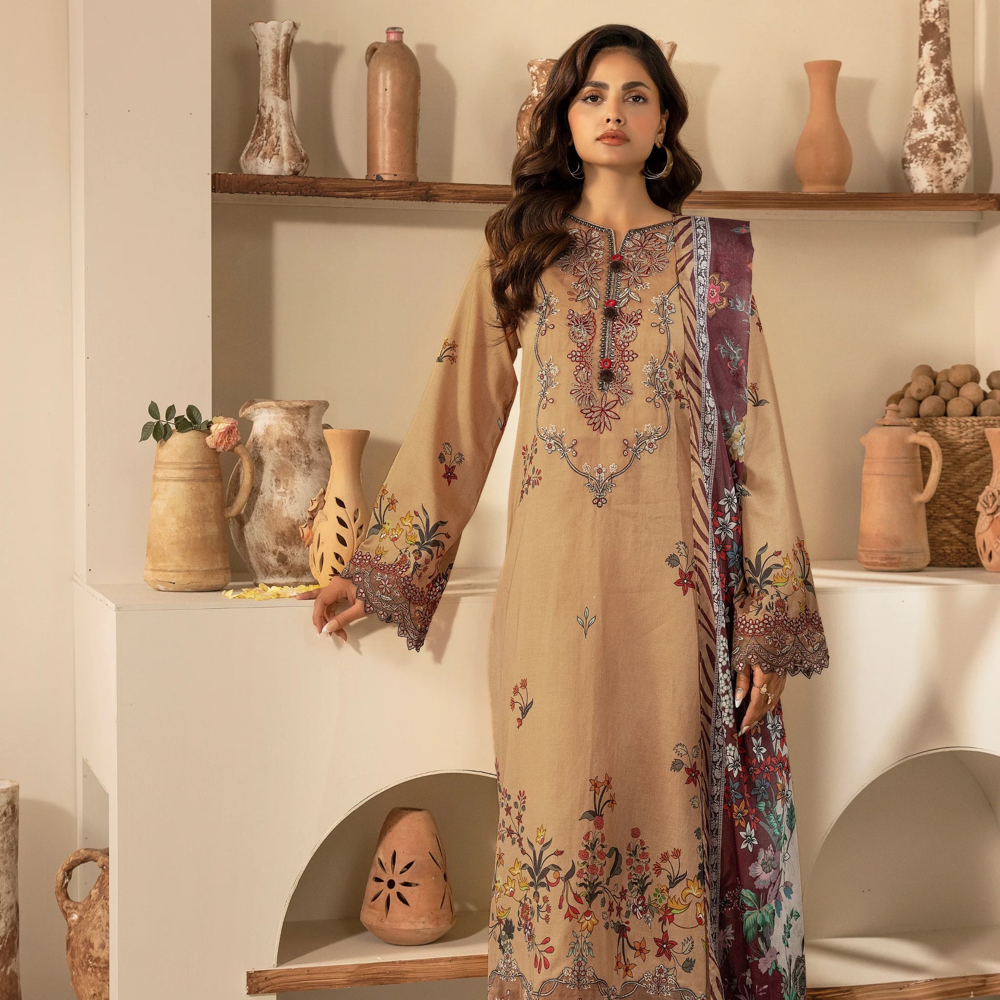 - 3 Piece Stitched Lawn Suit with digital print and Embroidery giving you a Stylish Look